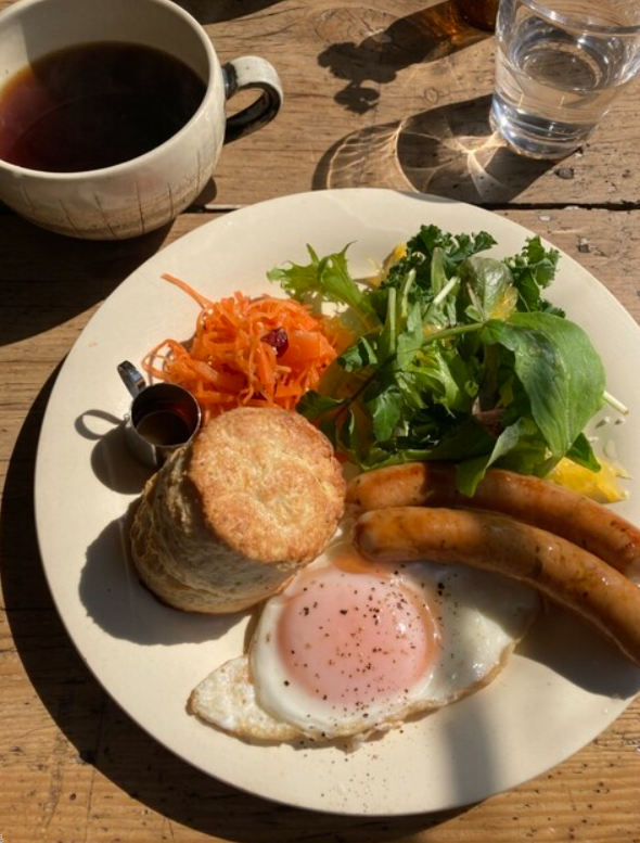 カリッと焼かれたスコーンは香ばしく、ソーセージは噛むたびにジューシー。目玉焼きと新鮮な野菜のバランスもよく、ひとつひとつが丁寧に作られているのが伝わってきます。